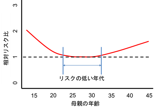では若ければ若いほど良いのかというとそうでもありません。例えば10代の妊娠では染色体異常を伴わない児の先天的な構造異常のリスクが20代に比べて高くなることが知られています(下図参照)。この調査結果によると胎児構造異常の視点からは23歳から32歳の10年間が妊娠するのに最もよい時期だと記載されています。