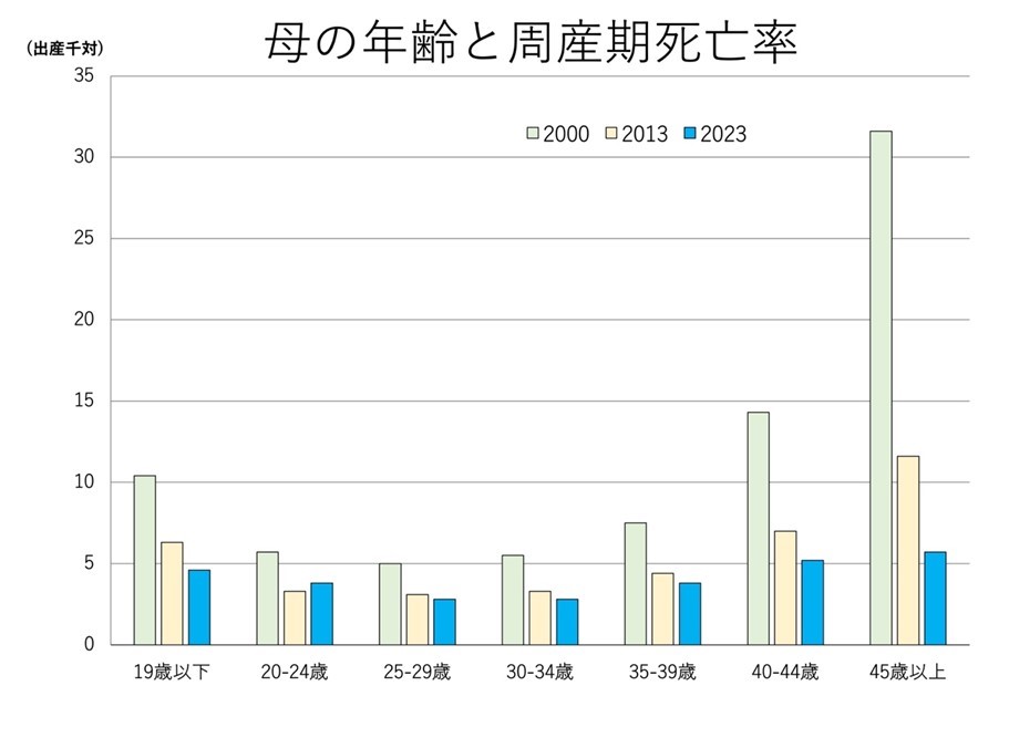 わが国における周産期死亡率について、各年の厚生労働省人口動態統計を参考に図示化し母の年齢による比較を行った。周産期死亡(妊娠22週以後の死産と早期新生児死亡の合計)